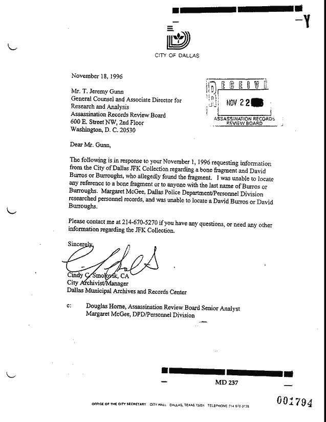 | MD 237 - Letter to ARRB from Dallas Municipal Archives, Dated November 18, 1996, Re: Weitzman/Burros Bone Fragment (With Initiating ARRB Correspondence Attached) |