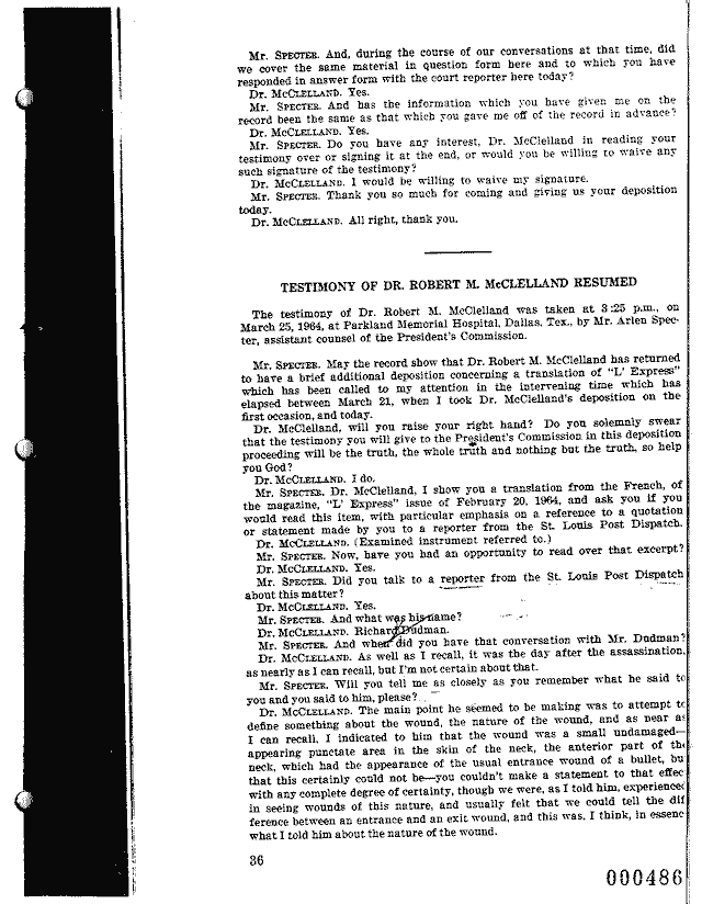 | MD 38 - Dr. Robert N. McClelland's 11/22/63 Handwritten Statement; and March 21,1964 WC Testimony |