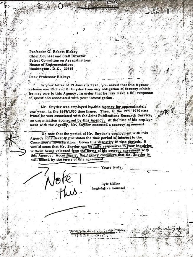 One of the most significant and least recognized documents relating to our studies was released by CIA some years ago. This comes to us in the form of a letter from Lyle Miller of Office of Legislative Counsel (OLC) to Professor G. Robert Blakey in which Mr. Miller outlines the parameters by which Mr. Snyder will be guided during any HSCA testimony. CIA was clearly troubled if Snyder testified and was released from his Agency oath, then Mr. Snyder would be compelled to admit to CIA employment for his entire career. Accordingly, as a result, they wrote to Professor Blakey as follows: