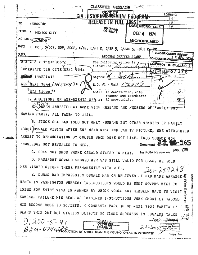 | 11-24-63 (MEXI 7054) Cable - Sylvia Duran Arrested at Home with Husband and Members of Family... |